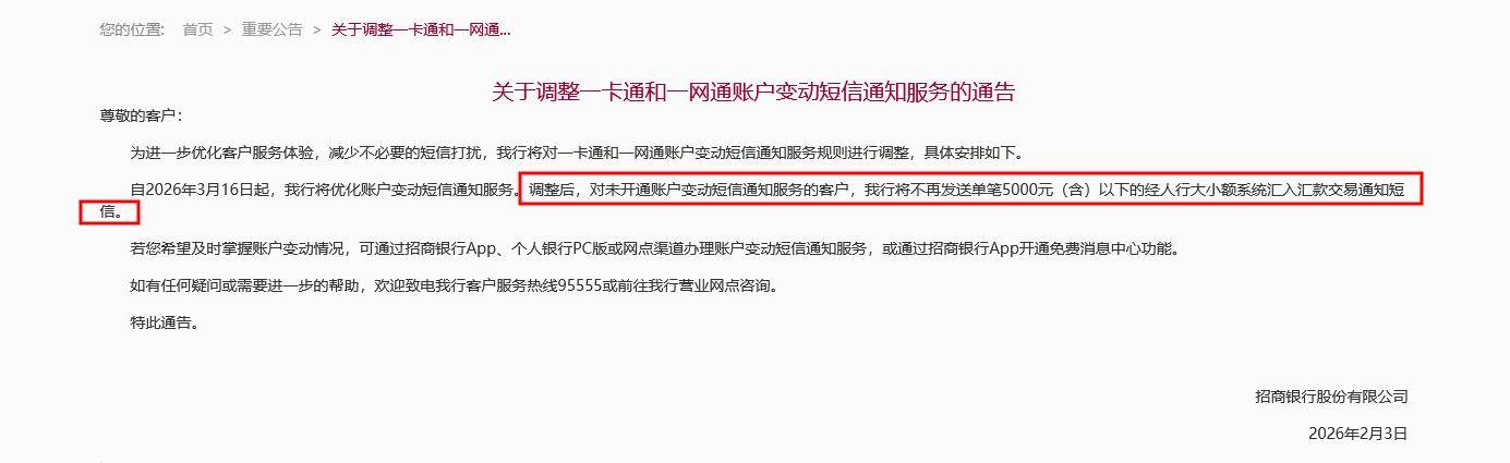 97国际-至尊品牌,源于信誉-财联社记者注意到,昨日招商银行在官网发文称,自3月16日起,将优化账户变动短信通知服务。调整之后,对未开通账户变动短信通知服务的客户,招商银行将不再发送单笔5000元(含)以下的经人行大小额系统汇入汇款交易通知短信。